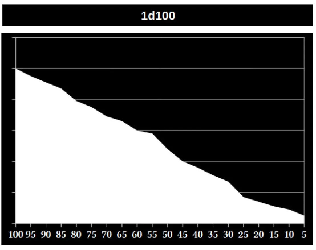 Técnicamente hablando el d100 funcionaría igual que el d20, tienes exactamente la misma probabilidad de obtener un 01 y un 100. ¿Entonces cuál es la diferencia? En otras mecánicas de dados el resultado es sumado a otro dado o al valor de un atributo y la dificultad suele ser estática (o haber un rango de dificultades); en el caso del d100 el resultado no se suma a nada, es simplemente el d100, y lo que varía es la dificultad que está definida individualmente por cada habilidad y por cada personaje. Esto implica que la probabilidad de obtener éxito dibuje una línea de dificultad descendente entre más se haya aumentado una habilidad: