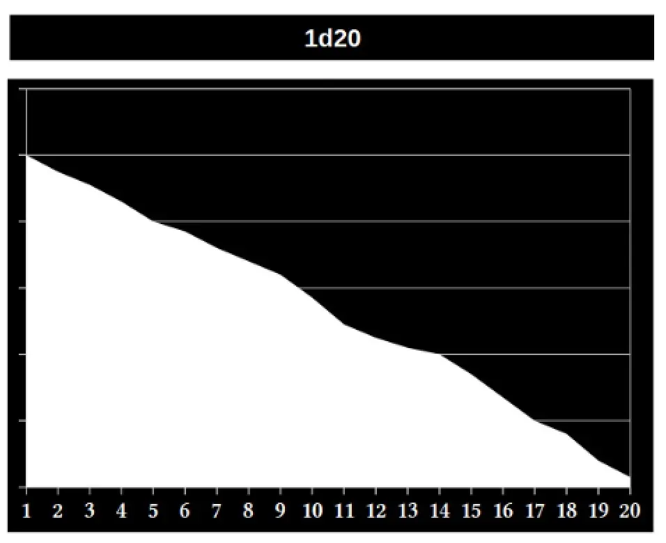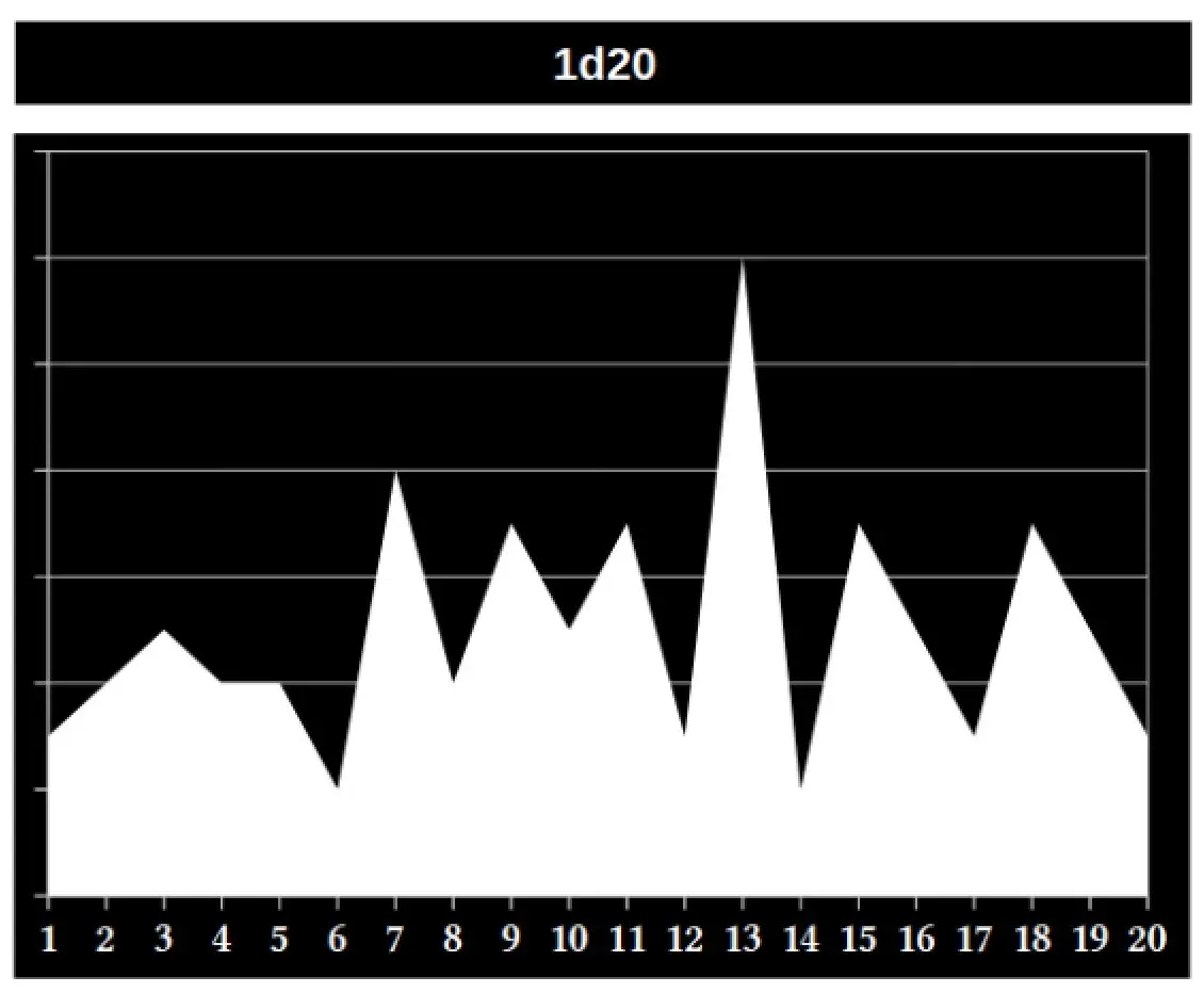 Una de las mecánicas más comunes en el rol es el uso del dado de 20 caras (d20), el resultado de la tirada normalmente se sumará o restará un valor fijo del personaje y se comparará al número de dificultad. ¿Cuál es el problema de esta mecánica? Que la probabilidad de obtener un 1 o un 20 es prácticamente la misma, dando un resultado completamente azaroso e irreal, pues tanto une personaje muy experimentade como une completamente novate tienen la misma probabilidad de tener un éxito crítico o un fallo crítico.