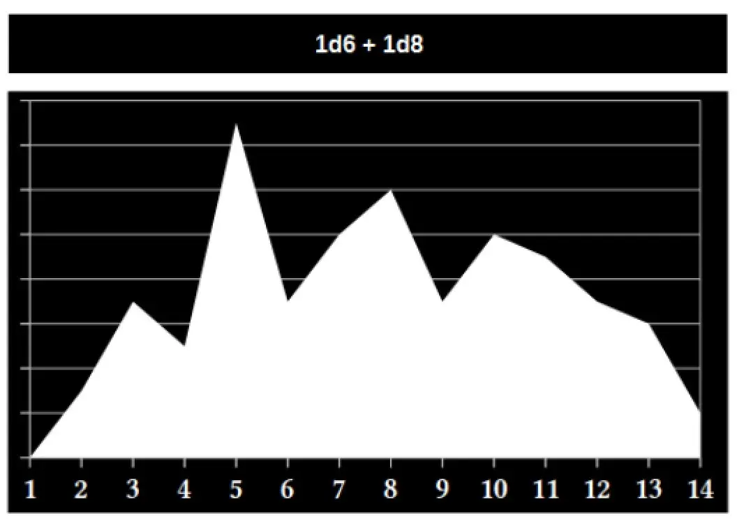 En las últimas dos gráficas podemos ver cómo, por el simple hecho de tirar más dados y sumar los resultados (sin sumar puntajes de atributos), los resultados estarán posicionados de manera más frecuente en valores intermedios. En la muchos sistemas que utilizan esta mecánica se añaden los dados de acuerdo a los atributos y se suman los dos mejores resultados, en otros casos se suman más, pero en general cuando se trata de sumar varios dados esta es la tendencia probabilística. Este tipo de mecánicas se llama pool dice, o algo similar a ‘alberca de dados??’ (suena muy extraño en español).
