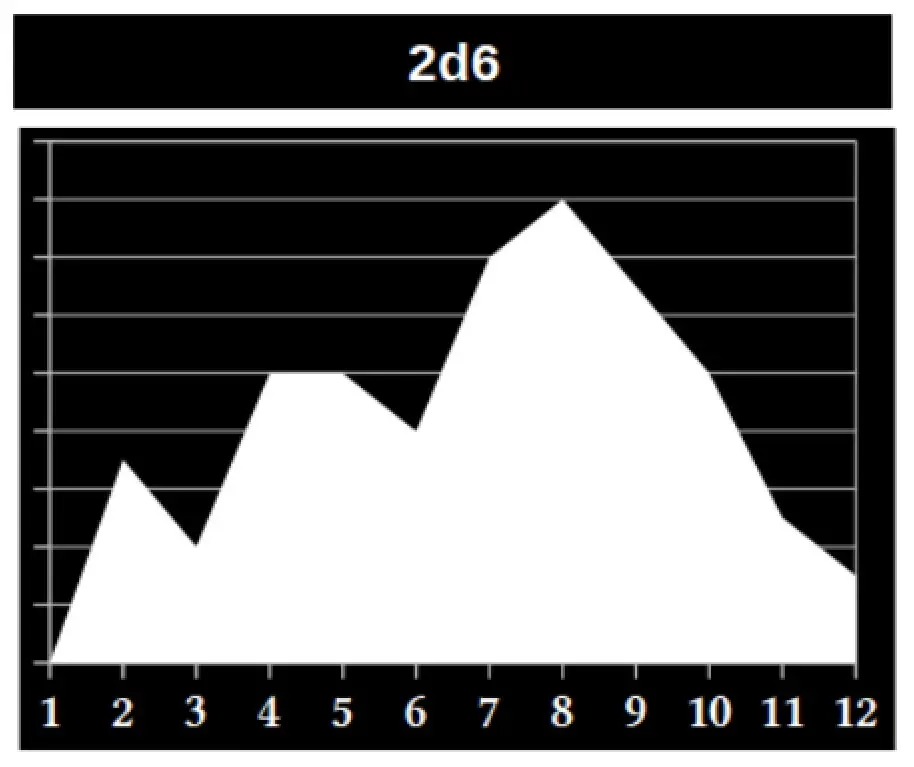 En la siguiente gráfica podemos ver el resultado de 100 tiradas de dos dados de 6 caras, en donde el resultado final es la suma de ambos dados (2d6).