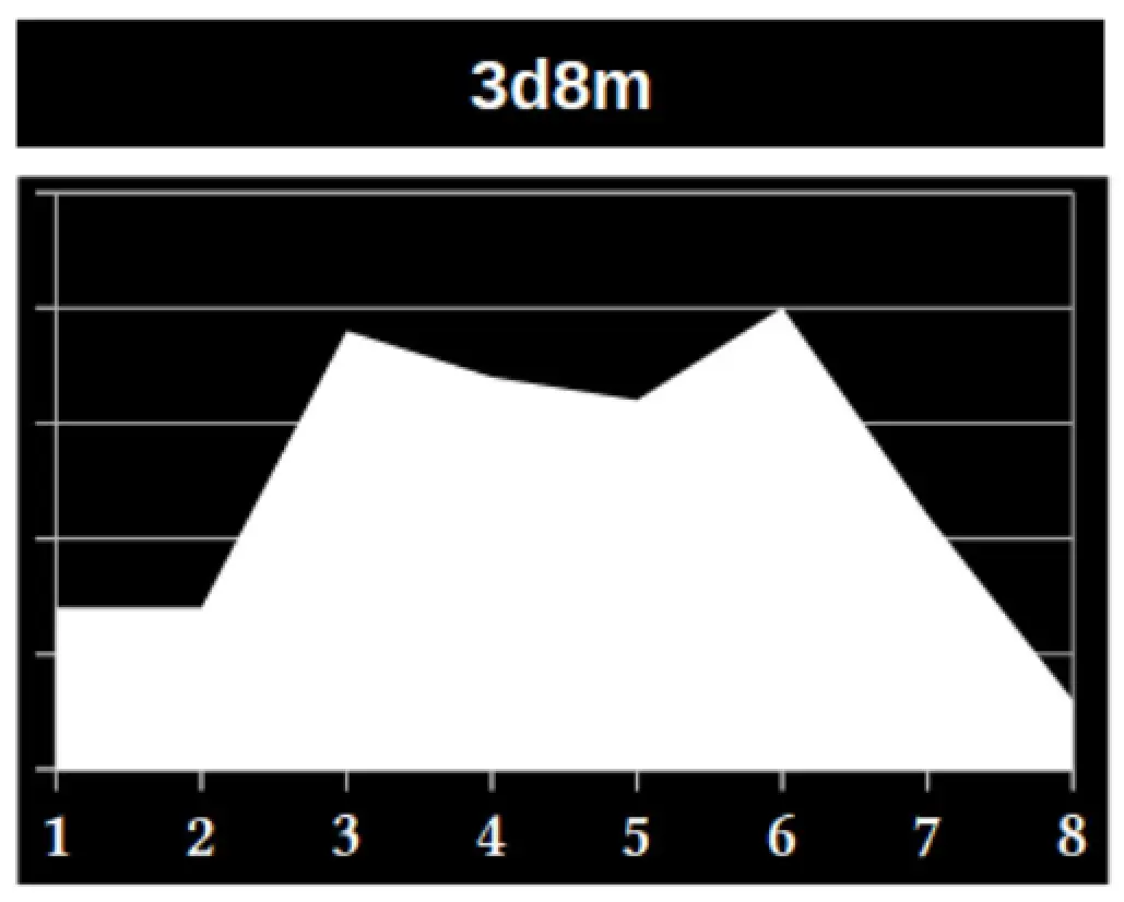 En las siguientes gráficas puede verse el balance que presenta este tipo de tiradas y la clara diferencia entre que la tirada sea normal (3d8m), con ventaja (3d8a) o desventaja (3d8b):